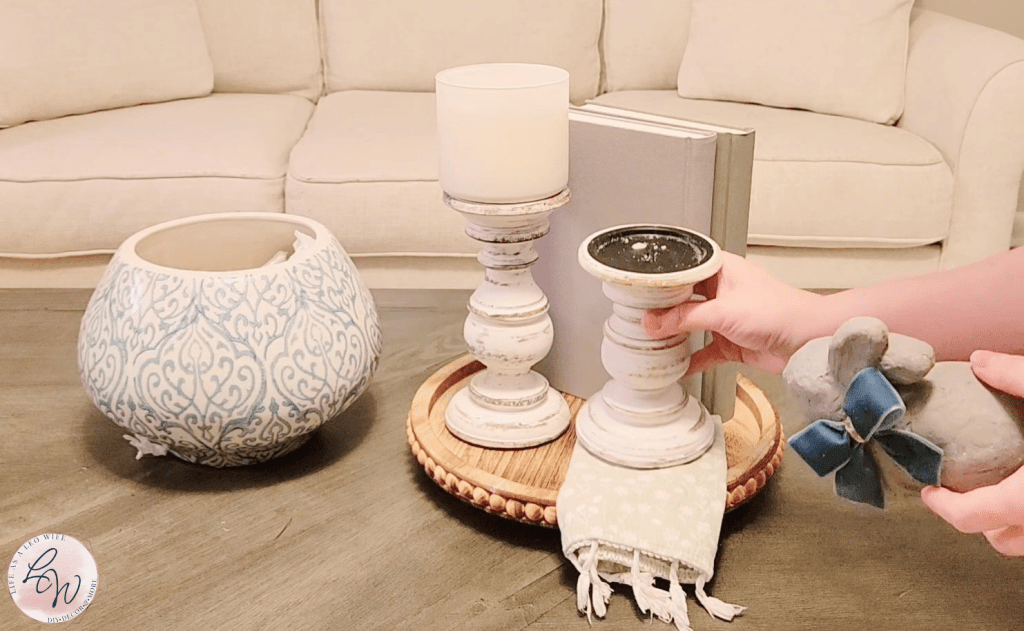 Now on to adding my trusty farmhouse style candlestick holders… one has a Bath & Body Works candle and the other holds a styrofoam bunny that I DIY’d. I created it to look like a concrete bunny because I, sadly, couldn’t find the metal bunny that I have that’s exactly like the taller one that Kayla used! I was devastated! That’s ok though because I love the “concrete” bunny! I will have a tutorial for that on Saturday to show you how to make your own for $2!