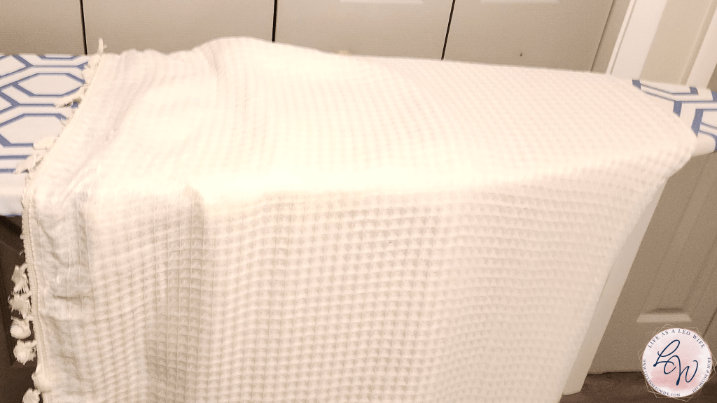 Next, I added a new duvet cover as well as beige sheets and a striped throw that match the farmhouse rug I shared last week. The color matches the blue flowers in the wall art piece that was part of my inspiration for the room. I have several more decorative pillow covers coming for the final reveal next week.